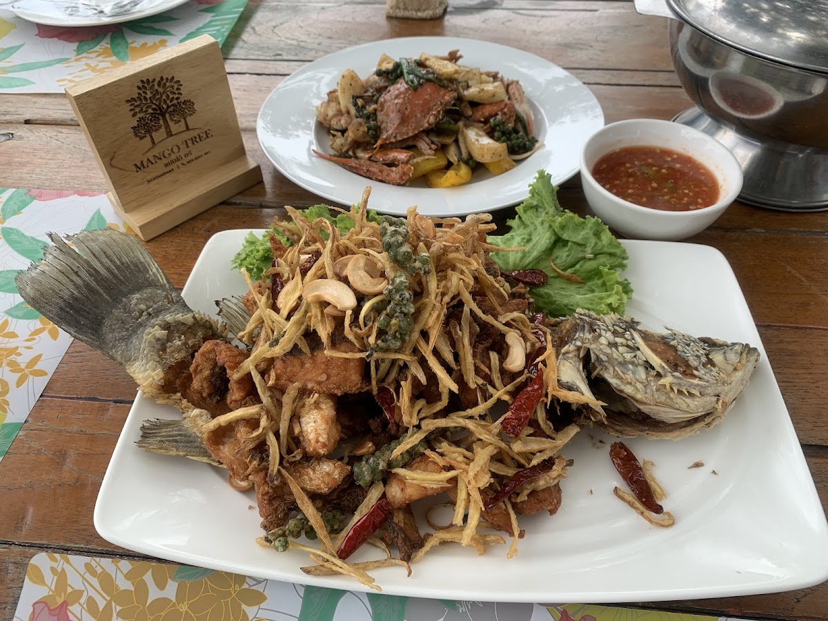 But there’s more than just sipping coffee here. The real draw is the easy access to an outdoor setting that invites camping right at the water’s edge, with tents pitched under the cliffs and gentle lighting around the trees after dusk. This setup naturally attracts groups who want to mix food, nature, and a laid-back social atmosphere. While the food menu stretches from Thai staples like กะเพราทะเล (stir-fried seafood with holy basil) and ยําวุ้นเส้น (spicy glass noodle salad) to fresher hits like แซลม่อนซาซิมิ (salmon sashimi), dishes are served in modest portions with an emphasis on savoring the environment as much as the meal.