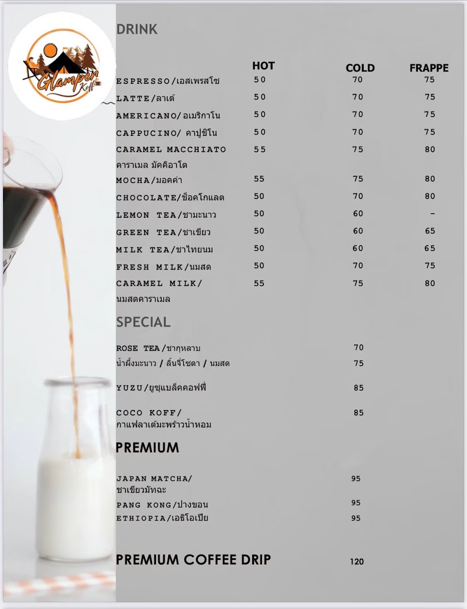 Glamper Koff Cliff Camp - กาแฟ อาหาร ลานกางเต็นท์ติดริมผาวิวน้ำ Menu