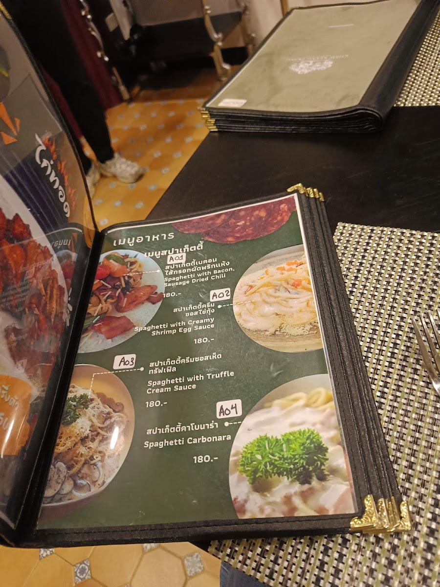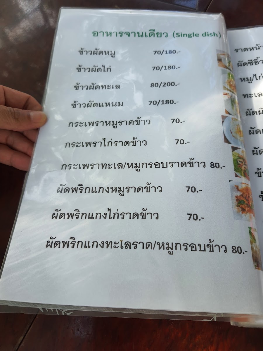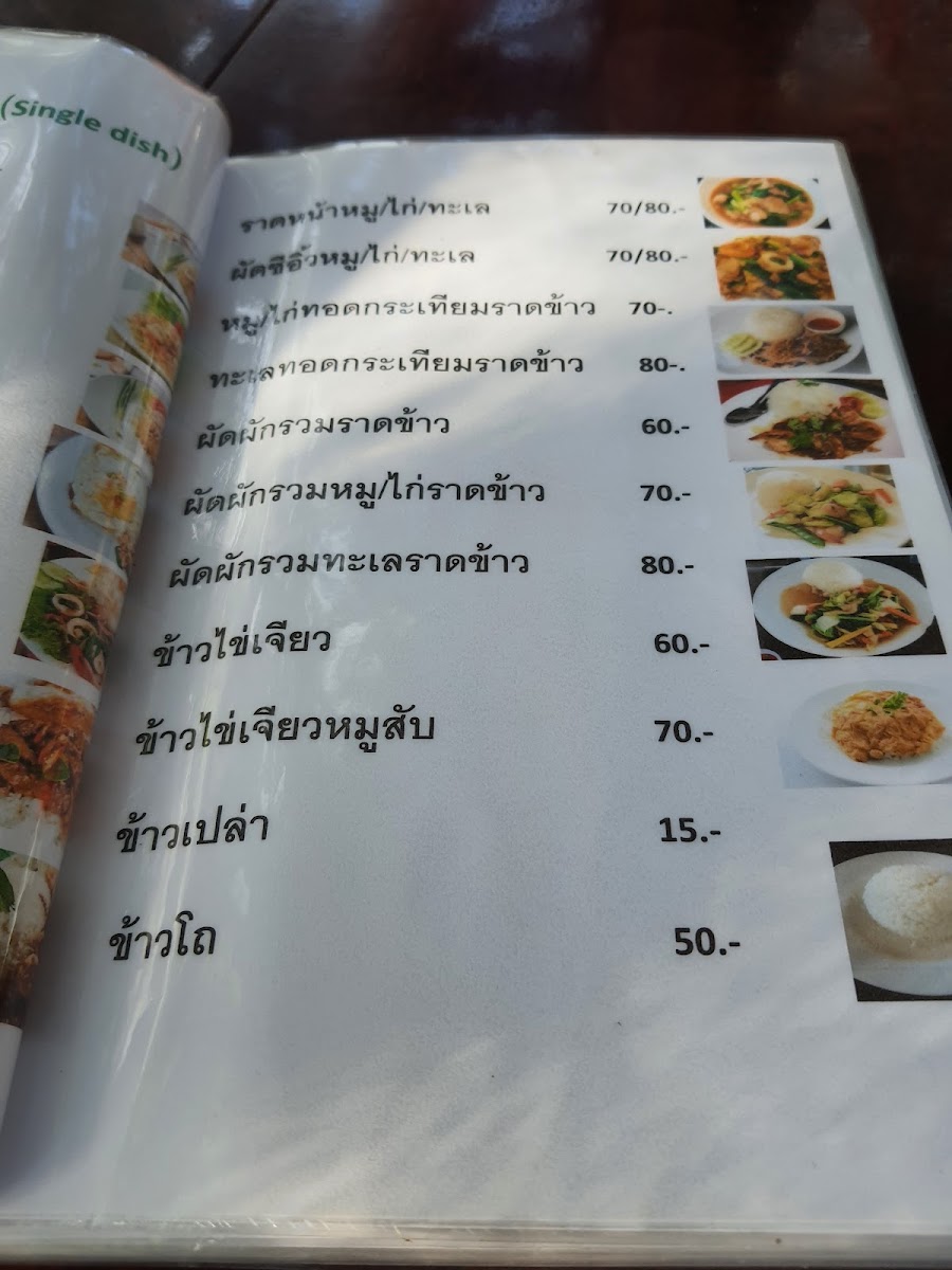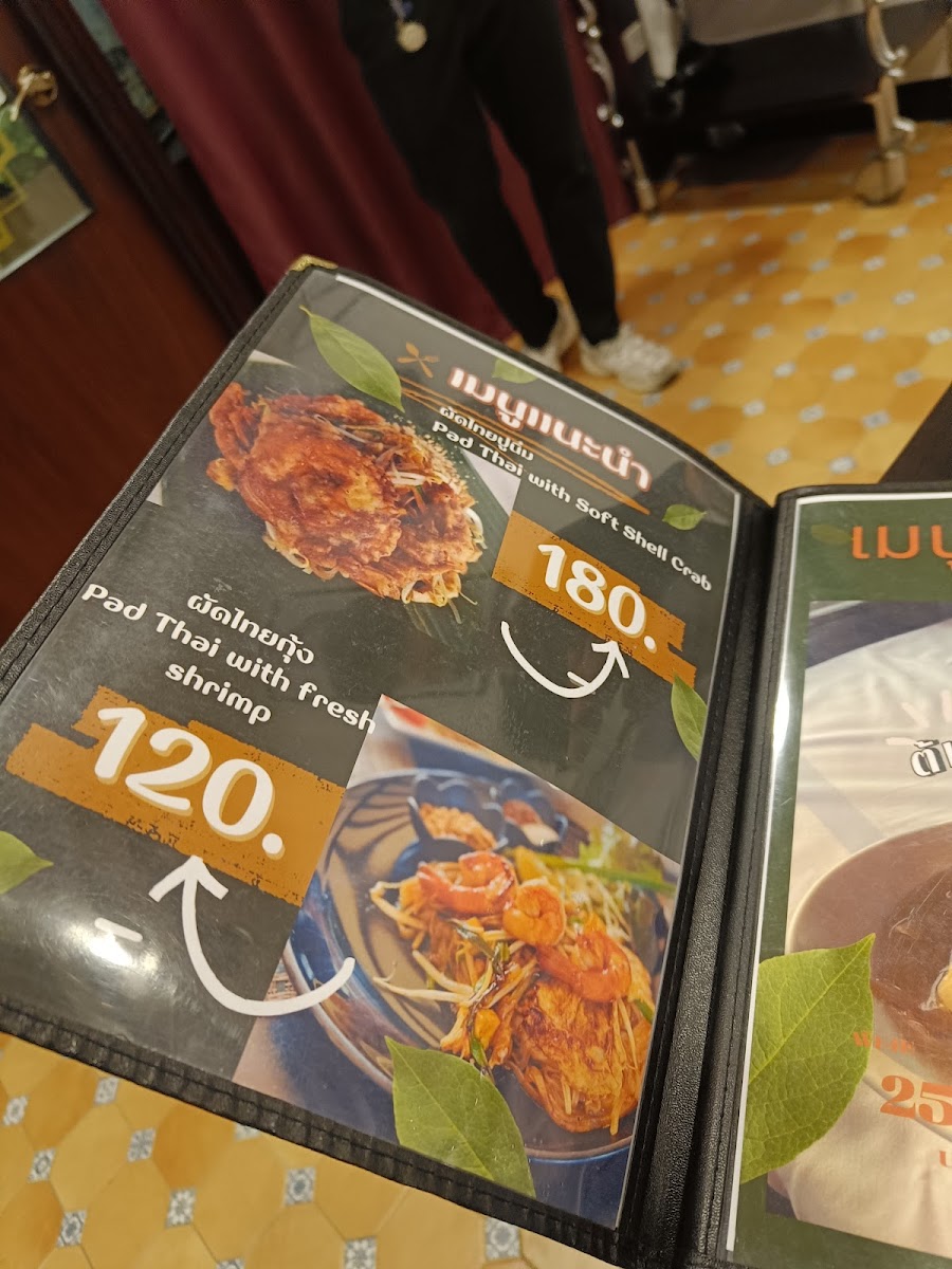 Food offerings include single-plate meals and shared dishes served in a minimalist style. Typical choices cover Thai staples, seafood, and noodle dishes, with highlighted items such as กะเพราทะเล (stir-fried seafood with holy basil), ยําวุ้นเส้น (spicy glass noodle salad), and แซลม่อนซาซิมิ (salmon sashimi). The menu also features bakery items like croissants and cakes, suitable for snacks or light bites.